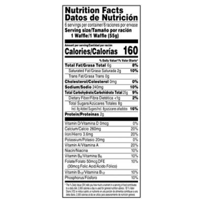 Eggo Waffles, Blueberry: calories, nutrition analysis & more ... For women: 100 calories (25 grams, 6 tsp per day) For men: 150 calories (37 grams, 9 tsp per day) The FDA is more "generous", the Daily Value for added sugars is 200 calories (50 grams, 12 tsp per day). Here at Fooducate, we suggest sticking to the stricter option (only 25 grams per day for women, 37 grams for men). More info. Eggo Waffles, Blueberry: calories, nutrition analysis & more ... Personalized health review for Eggo Waffles, Blueberry: 180 calories, nutrition grade (C plus), problematic ingredients, and more. Learn the good & bad for 250,000+ products. Eggo Blueberry Waffles Nutrition Facts - Eat This Much Nutrition Facts. For a Serving Size of 1 serving ( 70 g) How many calories are in Eggo Blueberry Waffles? Amount of calories in Eggo Blueberry Waffles: Calories 180. Calories from Fat 54 ( 30 %) % Daily Value *. Eggo Blueberry Flavored Waffles Nutrition Facts - GroceryNutrition.org Eggo Blueberry Flavored Waffles Ingredients. Eggo Blueberry Flavored Waffles contains the following ingredients: Enriched flour (wheat flour, niacin, reduced iron, vitamin b1 [thiamin mononitrate], vitamin b2 [riboflavin], folic acid), water, vegetable oil (soybean and palm, canola and/or cottonseed), sugar, dextrose, eggs, contains 2% or less of leavening (baking soda, sodium aluminum ...