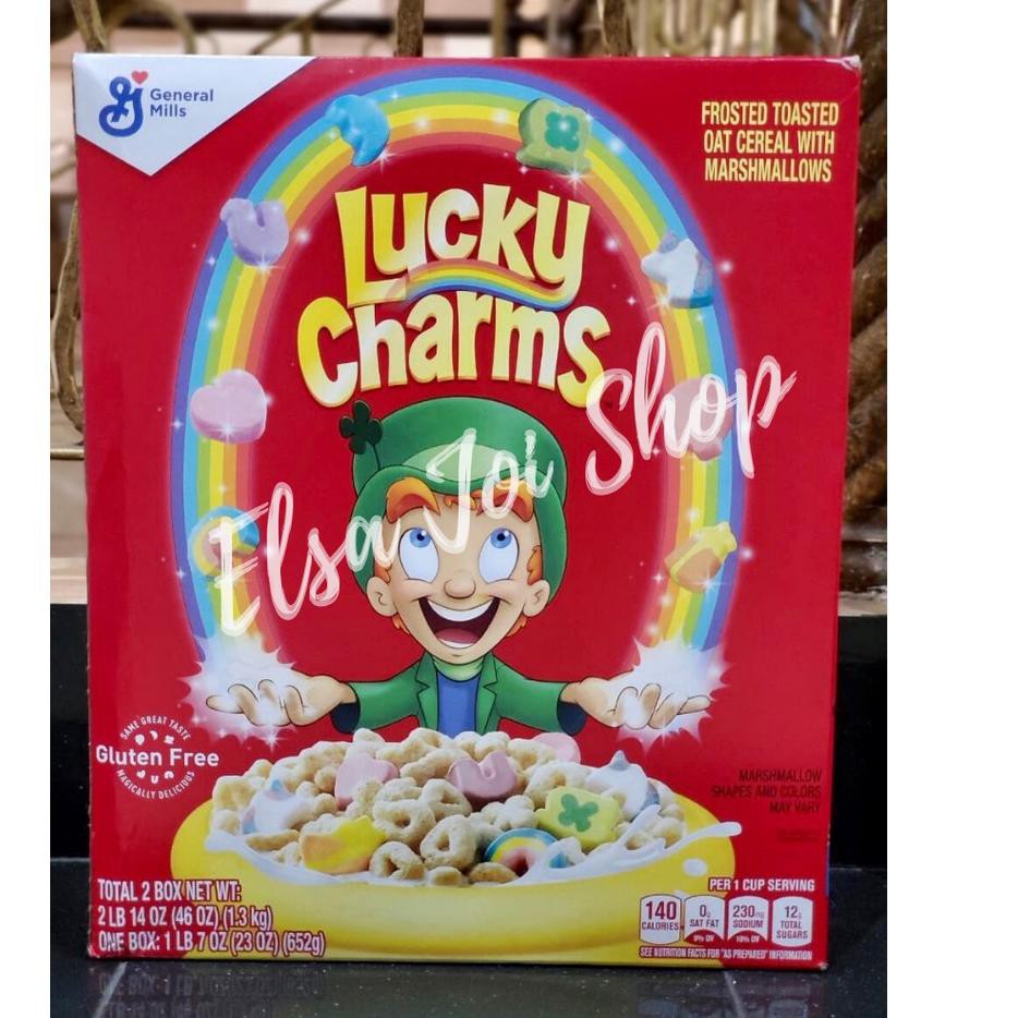 Lucky Charms Cereal Family Size - Shop Cereal & Breakfast at H-E-B Product description Frosted toasted oat cereal with marshmallows. Now with 3 rainbows! 110 calories, 0 g sat fat (0% DV), 170 mg sodium (7% DV), 10 g sugars per 3/4 cup serving. Whole grain first ingredient. At least 48 grams recommended daily. This cereal contains 11 g whole grain per serving.