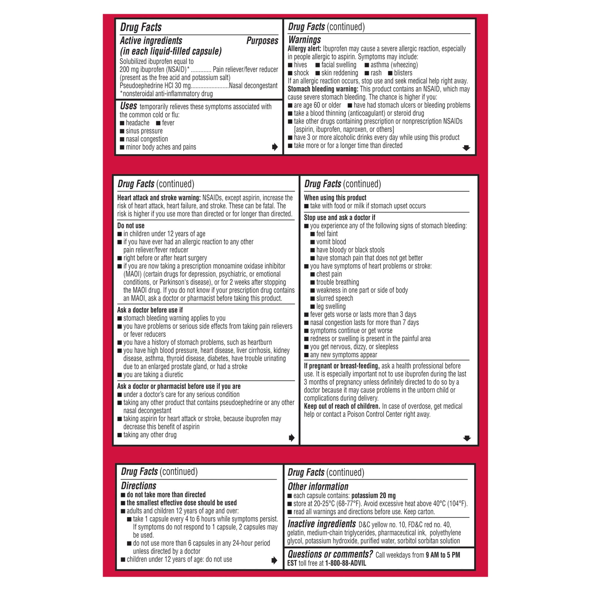 ADVIL COLD & SINUS Dosage & Rx Info | Uses, Side Effects Adult Dosage: Take with food. 1–2 caplets every 4–6hrs; max 6 caplets/24hrs. Children Dosage:. ADVIL COLD AND SINUS- ibuprofen, pseudoephedrine ... Drug Label Information · Active ingredients (in each liquid-filled capsule). Solubilized ibuprofen equal to 200 mg ibuprofen (NSAID)* (present as the free acid ...