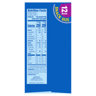 How many calories is a bag of pop secret popcorn. How Many Calories Are In: Pop Secret Butter Popcorn (1-bag) - FitWatch Calories In Pop Secret Butter Popcorn (1-bag) 100 Calories in 24 gram Note: This is a user-entered food item and may not be accurate. Search for More Foods Anti-Diet Culture - You Don't Need to Focus on Calories Hey there! Looks like you're interested in how many calories certain foods have? Cool, cool. Knowledge can be a good thing. Nutrition Facts for Popped Pop Secret Kettle Corn | Healthfully Fat. Pop Secret Kettle Corn contains 13 g of total fat per serving, amounting to 20 percent of the recommended daily maximum fat intake if you eat a 2,000-calorie diet 1. The fat in the popcorn includes 2.5 g of saturated fat and 5 g of trans fat. The Food Guide Pyramid recommends limiting saturated fat intake to no more than one-third of total ... How many calories are in a bag of orville redenbacher microwave popcorn? How many calories in a whole bag of Pop Secret Movie Theater Butter? They assume each bag is 3 servings, at 130 calories per serving (i.e. a little less than 400 calories per bag). Per serving, there is 4 grams of saturated fat (the bad kind of fat), 270 mg of Sodium (not too high), and 2 grams of protein. Calories in Pop Secret Butter Popcorn and Nutrition Facts There are 130 calories in 4 cups popped (26 g) of Pop Secret Butter Popcorn. Calorie breakdown: 56% fat, 38% carbs, 6% protein. Related Popcorn from Pop Secret: Homestyle Microwave Popcorn (Snack Size) White Cheddar Popcorn: Kettle Corn: 94% Fat Free Microwave Butter Popcorn: