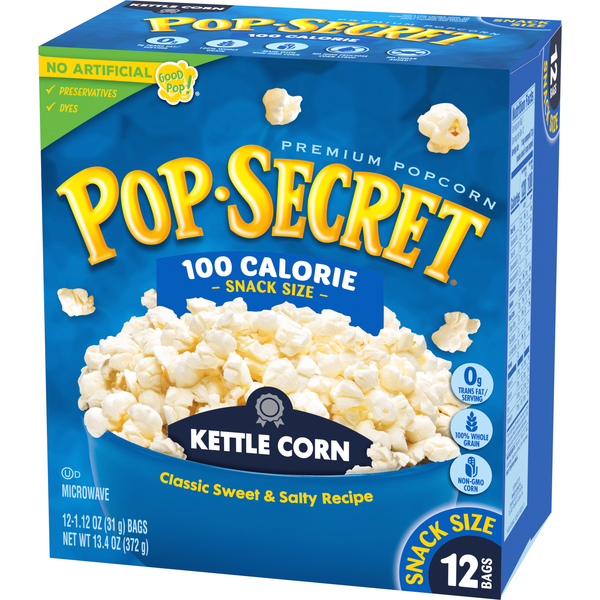 Pop-Secret Calories and Nutrition Information. Page 1 Calories and nutrition information for Pop-Secret products. Page 1. Calories and nutrition information for Pop-Secret products. Page 1. Toggle navigation Toggle search bar. App Database; ... Homestyle Popcorn. 1 bag unpopped : 130: Jumbo Popping Corn. 3 tbsp unpopped : 120: Kettle Corn. 1 bag unpopped : 120: Kettle Corn Popcorn. 2 tbsp unpopped ...