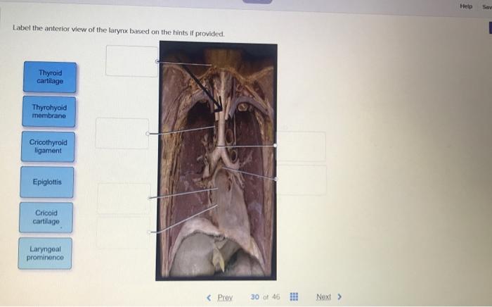 SOLVED: Label the structures seen in the anterior and posterior view of ... Label the structures seen in the anterior and posterior view of the larynx Labels may be used more than once: Trachea Hyoid bone Vocal folds Thyroid carilage Cricoid carilaga Epigbtk cartlege We don't have your requested question, but here is a suggested video that might help. Related Question Match the words with their descriptions. quizlet.com › 504117395 › lung-flash-cardsLUNG Flashcards | Quizlet Label the anterior view of the lower respiratory tract based on the hints if provided. Label the anterior view of the larynx based on the hints if provided. Complete each statement with the correct word and then place the sentences in order starting with the most proximal structure. Solved Label the anterior view of the larynx based on the - Chegg Transcribed image text: Label the anterior view of the larynx based on the hints if provided. Cricothyroid ligament Laryngeal prominence Thyroid cartilage Thyrohyoid membrane Cricoid cartilage Epiglottis Reset Zoom Previous question Next question › 40412391 › Clinical_case_studiesClinical case studies in physiotherapy - Academia.edu The purpose of this study was to assess the gait asymmetries in terms of temporal and force gait parameters using Computer Dynography (CDG) system in a hemiparetic person.