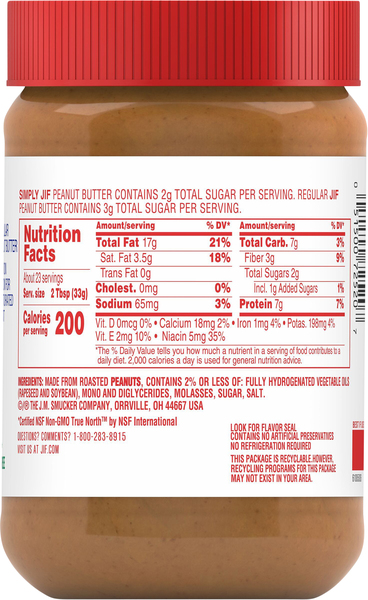 Simply Jif Creamy Peanut Butter, 15.5 Ounces - Smuckers Shop From a brand that has been trusted for generations, Simply Jif Creamy Peanut Butter gives you all of the fresh roasted peanut taste you love with 33% less ... Creamy Peanut Butter| Jif® Made From Roasted Peanuts And Sugar, Contains 2% Or Less Of: Molasses, Fully Hydrogenated Vegetable Oils (Rapeseed And Soybean), Mono And Diglycerides, Salt.