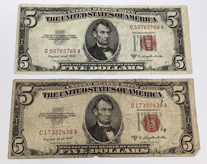 Five Dollar Bill Red Seal Series 1953 US Currency - YouTube Five Dollar Bill Red Seal Series 1953 US Currency this Five Dollar Bill Red Seal Series 1953 US Currency. These Red Seal Five Dollar Bills are off-quality notes that may have some... 1953 red seal 5 dollar bill for sale | eBay 1953 Five Dollar Bill Red Seal Note Randomly Hand Picked VG - Fine FREE SHIPPING $17.44 $10 off every $100 or Best Offer lowestpricedcents (31,011) 99.3% Free shipping Sponsored 1953 Five Dollar RED Seal Note United States Note Old US Bill $5 Average Circ $12.99 akninja (135) 98% Buy It Now +$3.00 shipping 9 watchers Sponsored How Much Is 1953 Red Seal 2 Dollar Bill Worth? (Know The Value) Any 1953 red print $2 should sell for about $2.50. About $8 per note for 100 consecutive red writing two dollar bills. The same goes to smaller runs of consecutive notes. If you have 1953 $2 star notes in decent condition, then expect to get about $5 for it while $15 for uncirculated. 1953 two dollar bills aren't rare since there were ... 1953 $5 Red Seal Value - How much is 1953 $5 Bill Worth ... 1953 $5 Red Seal Value - How much is 1953 $5 Bill Worth? August 6, 2017 by Brendan Meehan Five Dollar Notes › Legal Tenders › 1953 Five Dollar Legal Tender Or United States Notes Limited Value - No Submissions Find other notes you possess from menu. Submit where indicated. Other $5 Bills No Obligations Offers and Appraisals